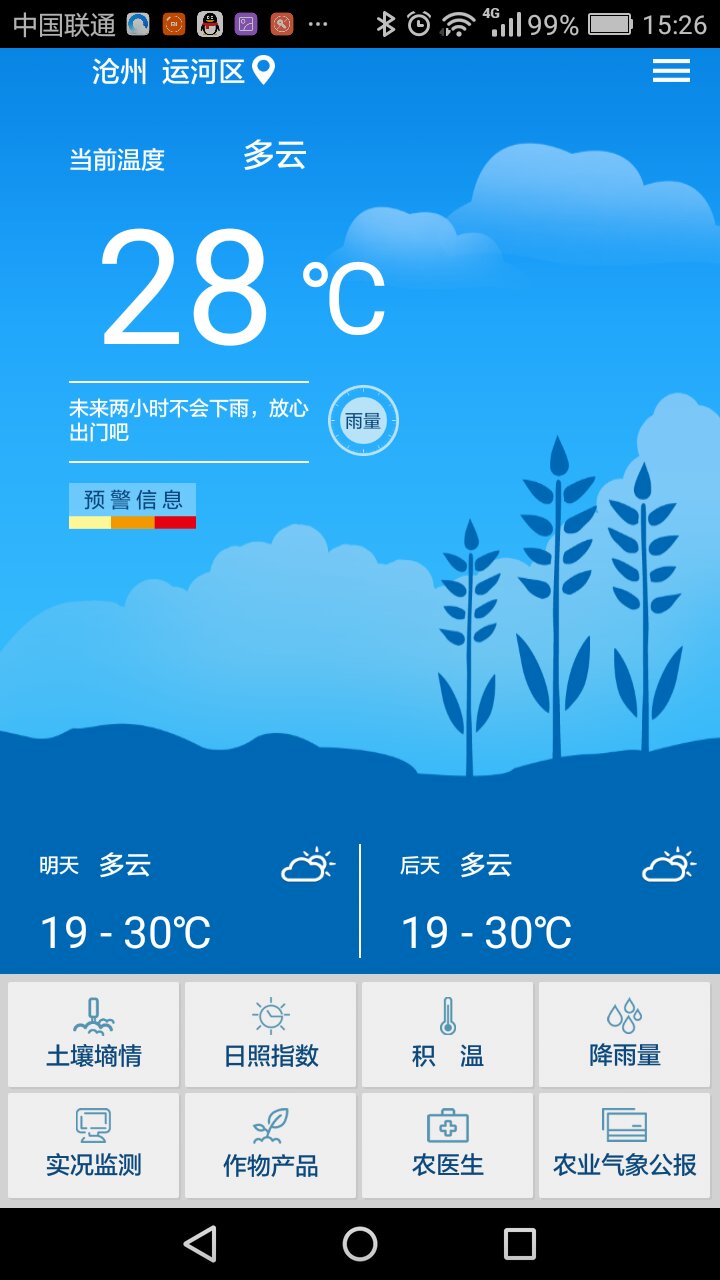 “好天气APP”,是一款服务于个人、农户、种粮大户、农产品商户的手机软件。拥有 “好天气APP”,就拥有了属于个人的气象台,可以实时获得天气实况温度降水风力数据、10-20厘米土壤墒情、当月当季当年的日照时数、积温、降水量;未来两天、三天、十五天天气预报;农业气象公报、农业资讯、农产品市场、农业气象影视节目、天气在线咨询等等,信息多多。