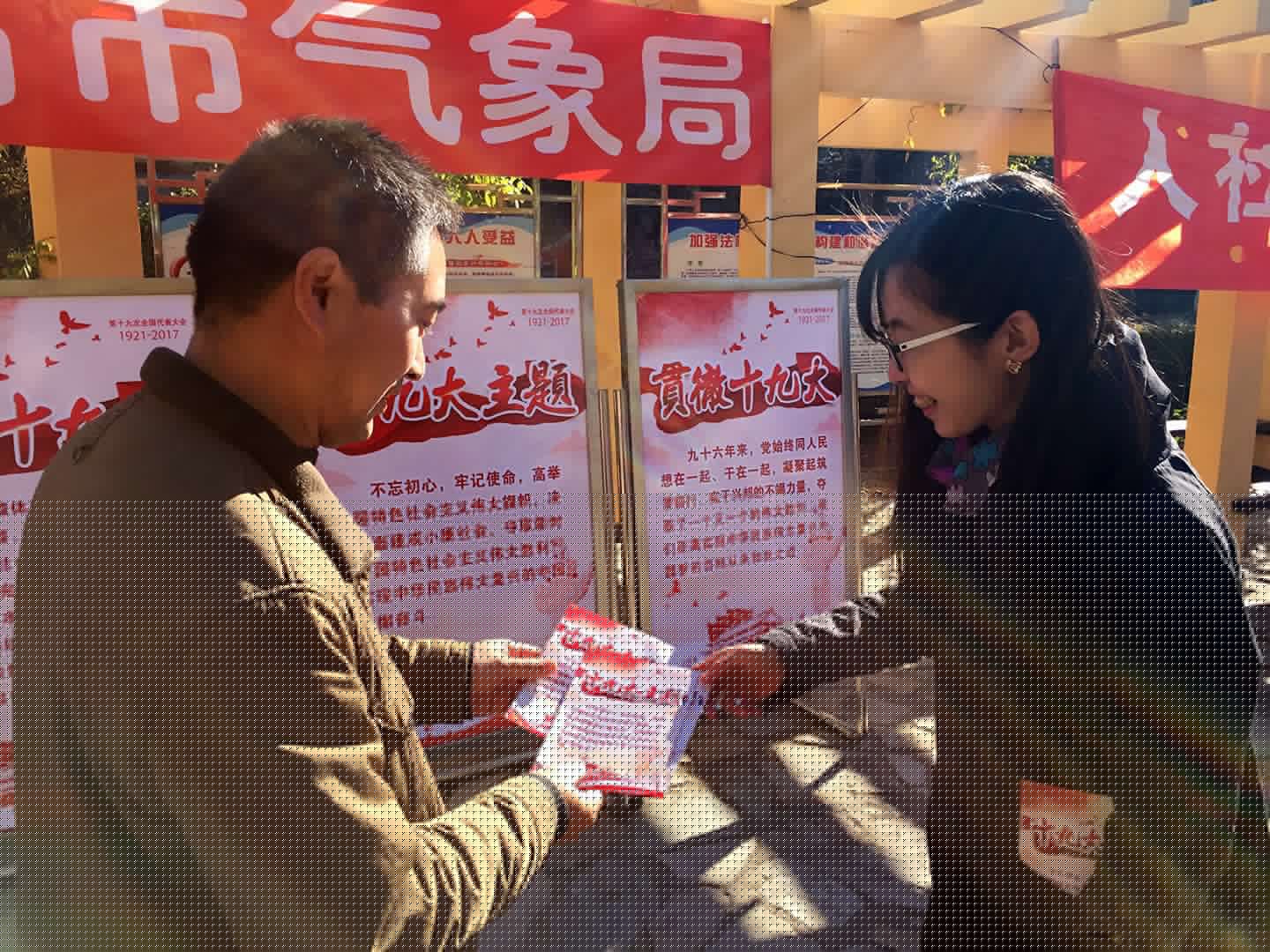 为响应市委号召,按照市委统一部署和安排,11月11日上午,市气象局在红桥蓝座社区组织开展了“宣讲十九大,服务进社区”党员集中活动。