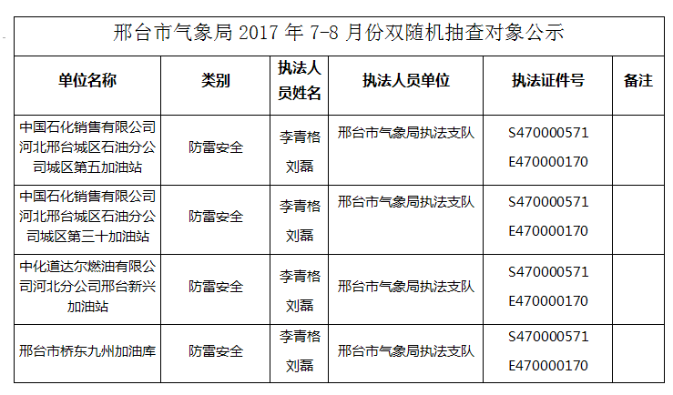 邢台市气象局2017年7-8月份双随机抽查对象公示